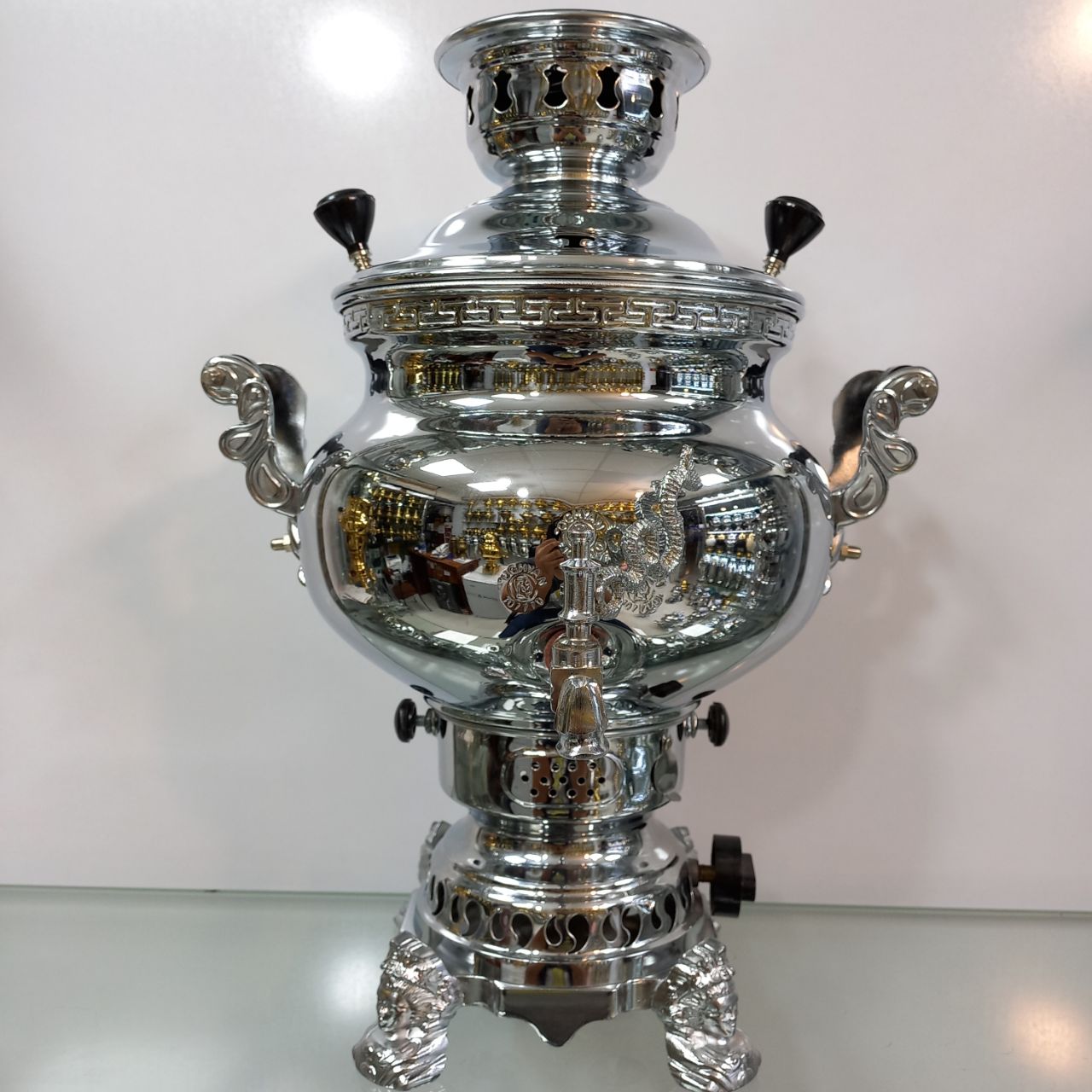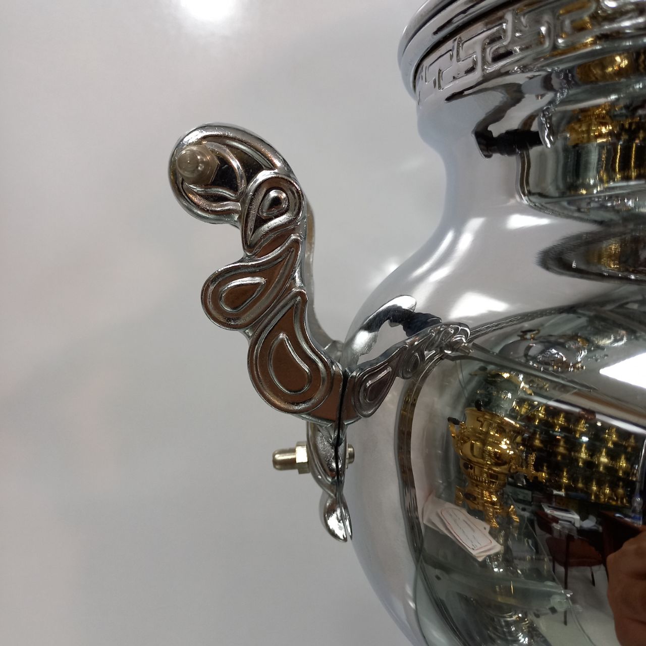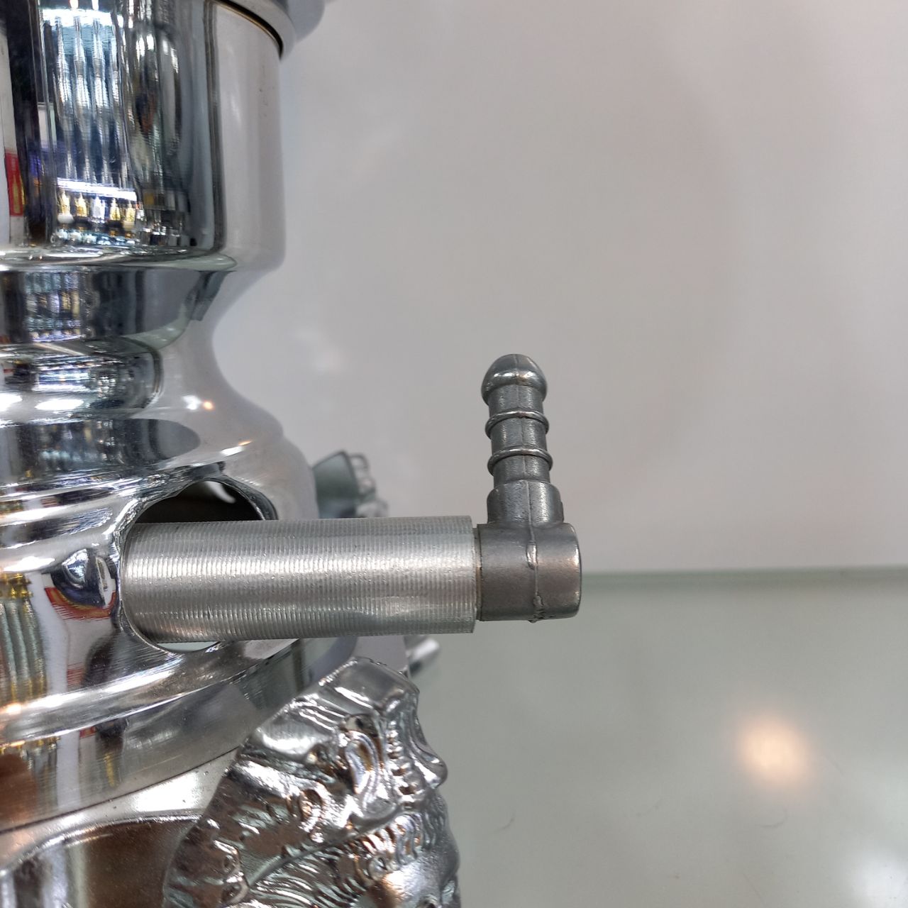 سماور گازی طغیان مدل خمره ای ساده ظرفیت ۶ لیتر رنگ نیکل کروم ضخامت ورق ۸ دهم جنس بدنه برنج دارای یک سال ضمانت و گارانتی