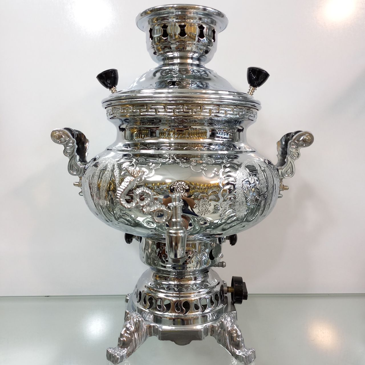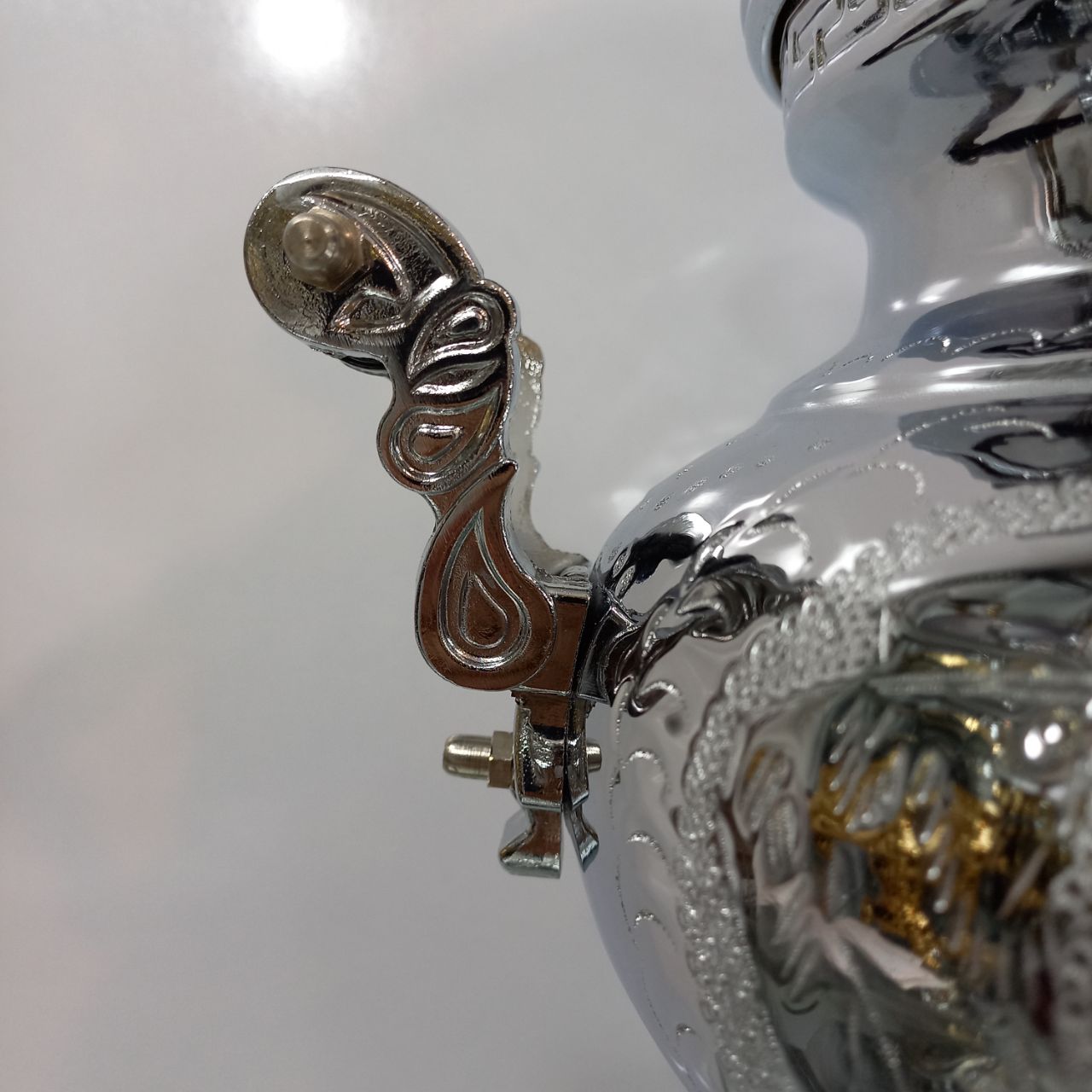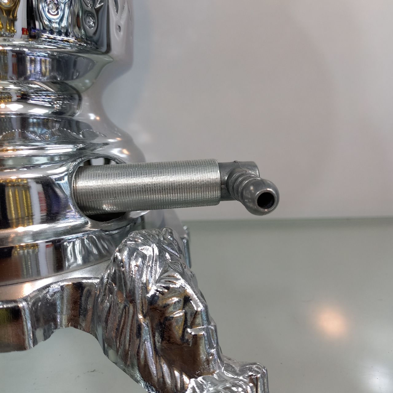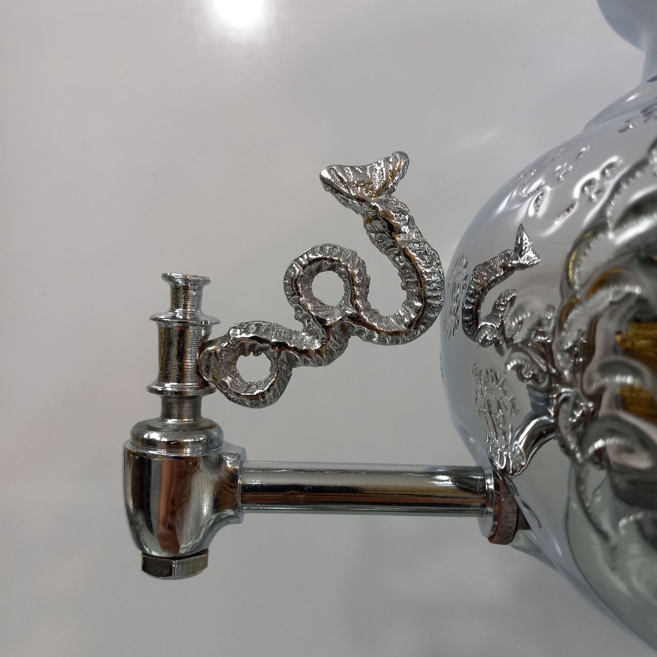 سماور گازی طغیان مدل عدسی قلم ظرفیت ۸ لیتر رنگ نیکل کروم ضخامت ورق ۸ دهم جنس بدنه برنج دارای یک سال ضمانت و گارانتی
